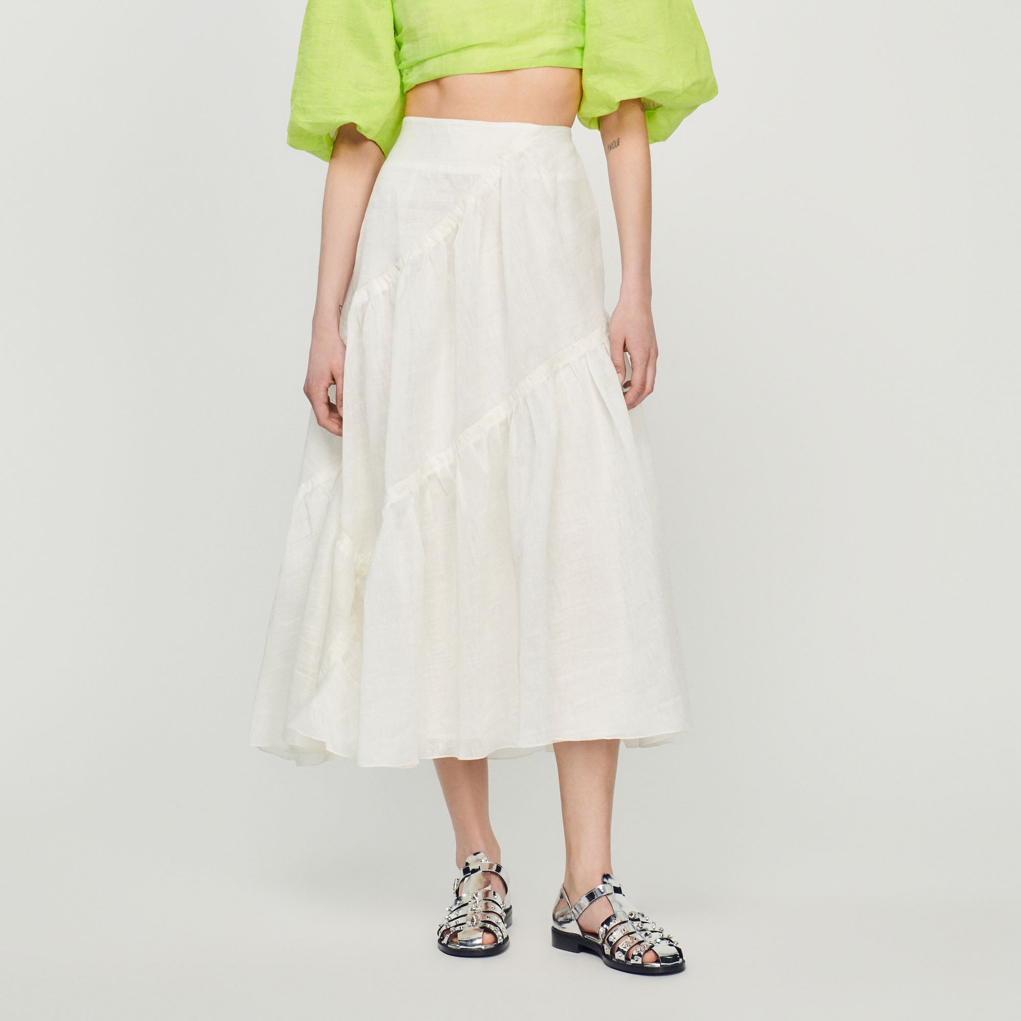 Jupe longue légèrement évasée à jeux de volants et de fronces, munie d'une fermeture zippée sur le coté.