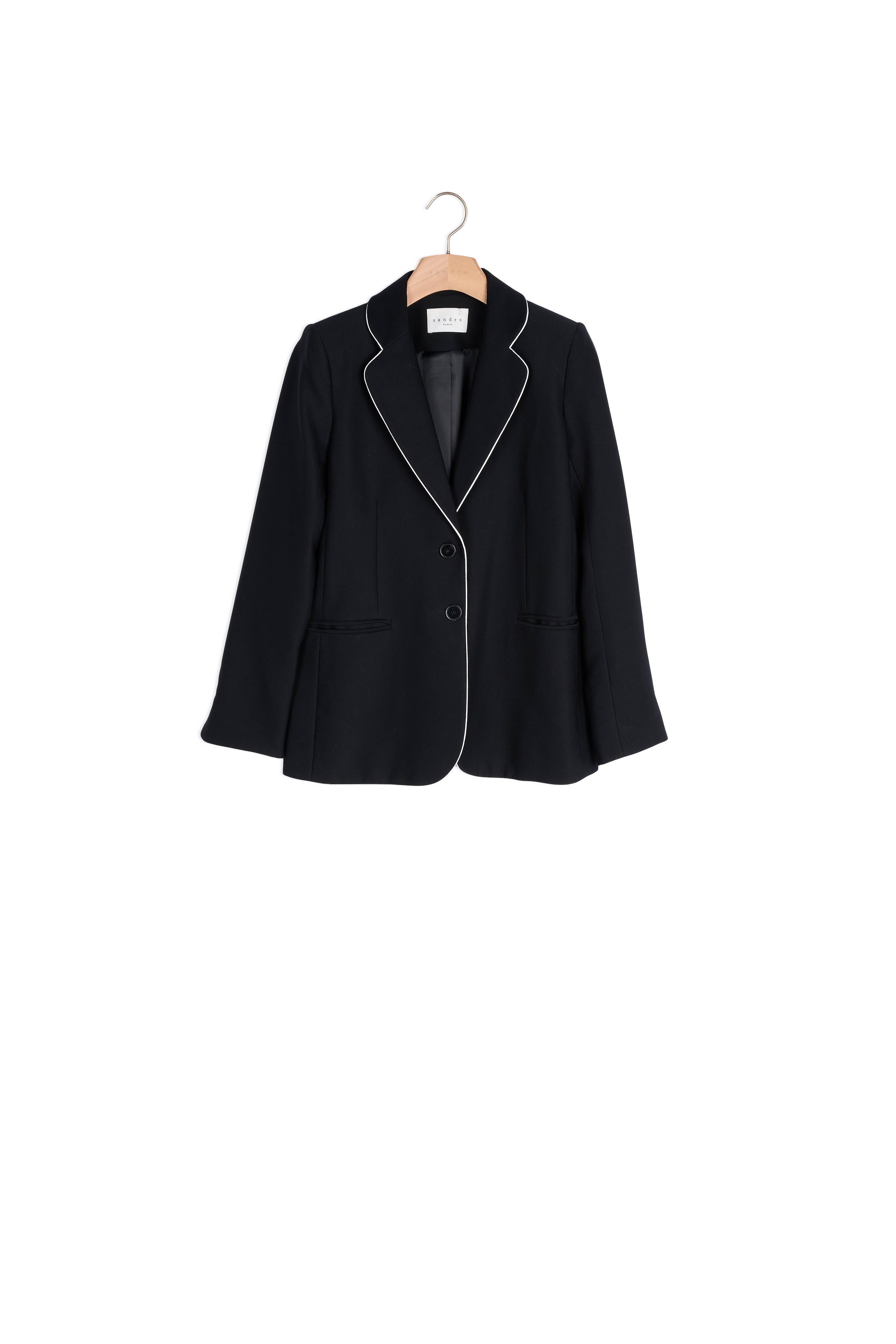 Blazer von Sandro mit langen Ärmeln und italienischem Ausschnitt. Paspel in Kontrastfarbe über die gesamte Länge. Zwei Paspeltaschen. Vorne mit zwei Knöpfen zu schließen. Dieser sehr elegante Blazer trägt sich perfekt zur passenden Hose. Das Model trägt Größe 36.