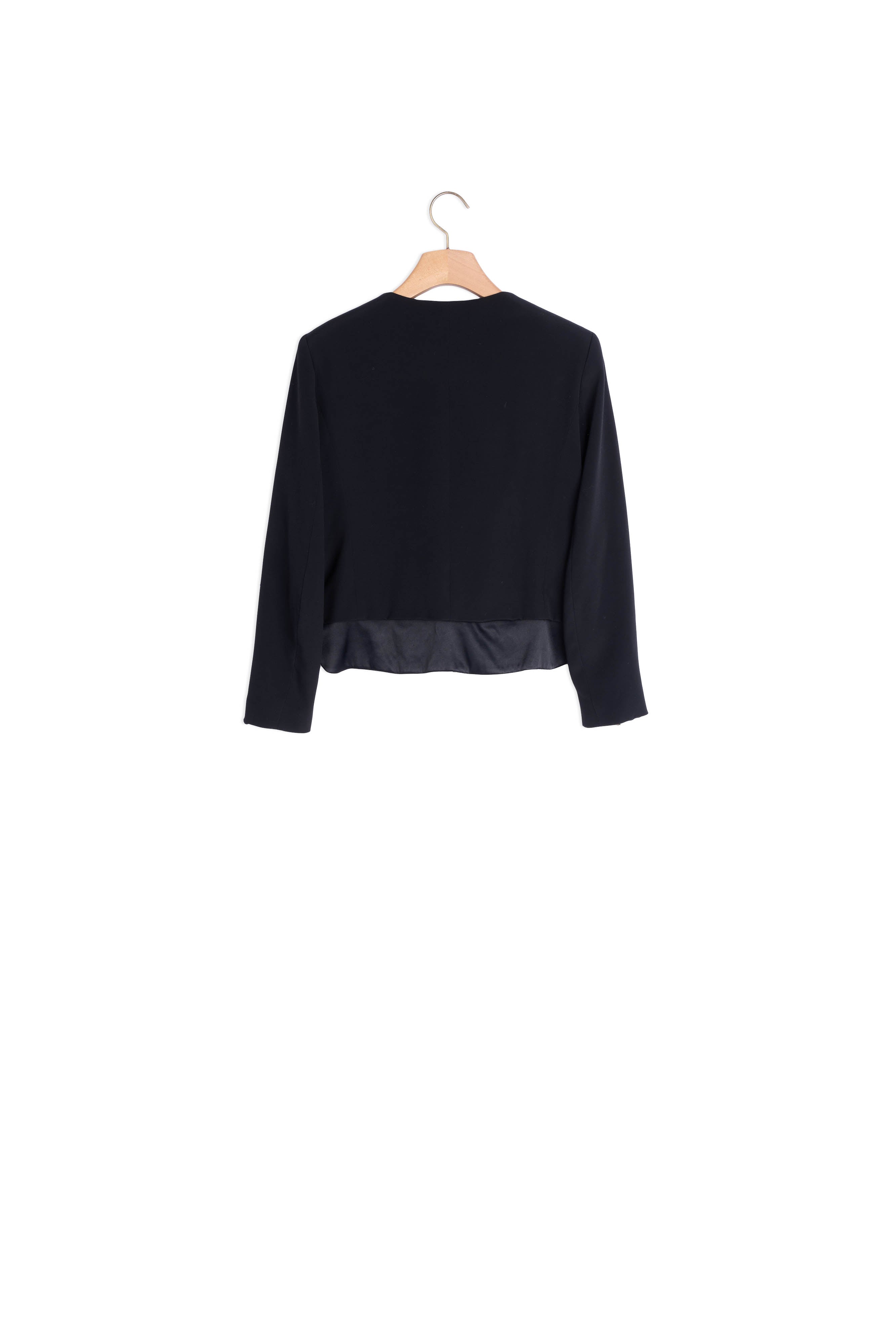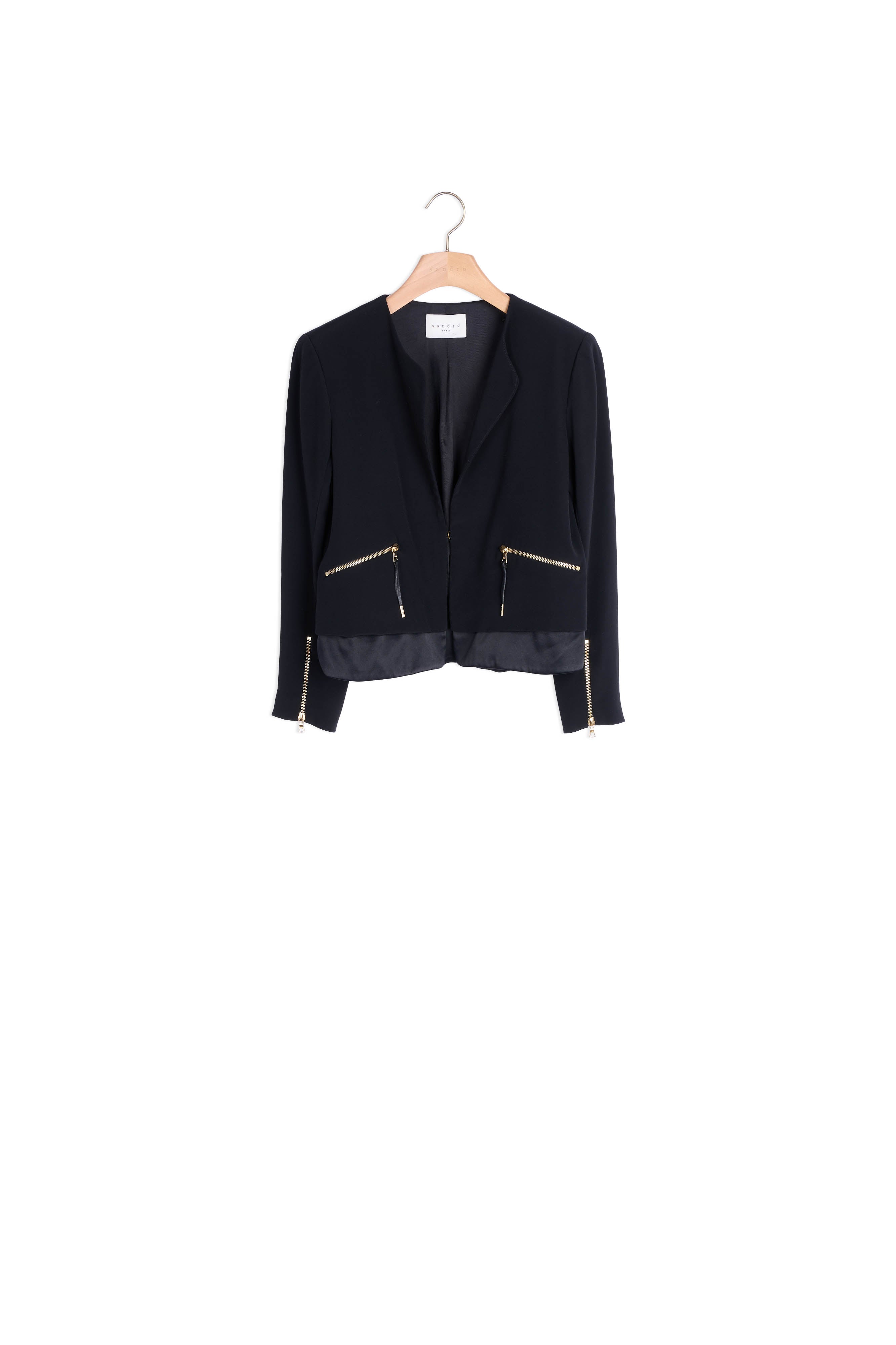 Kurze Jacke von Sandro Lange Ärmel und Rundhalsausschnitt Das Modell besitzt Taschen mit Metallreißverschluss Kontrastfarbenes Zugband aus Leder Mehrere Reißverschlüsse an den Ärmelabschlüssen Hakenverschluss vorne Aufsätze im Materialmix am unteren Teil der Jacke Vollständig gefüttert Ideal für einen schicken, eleganten Look Das Model trägt Größe 36