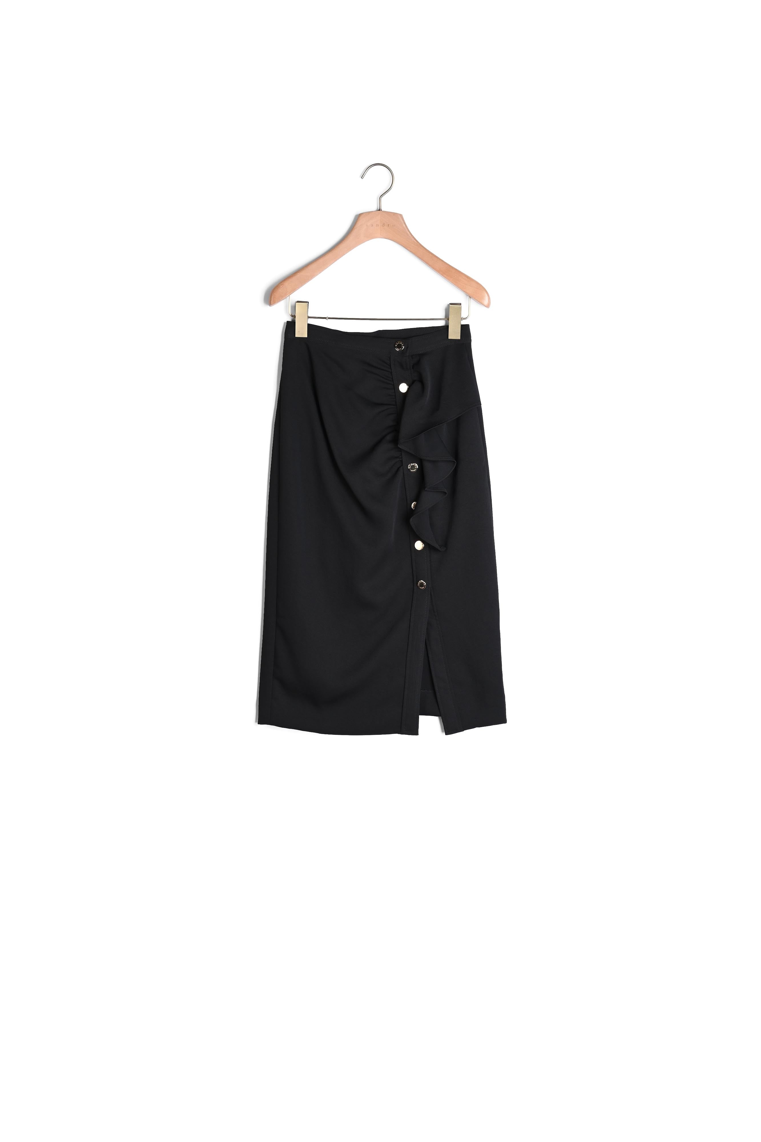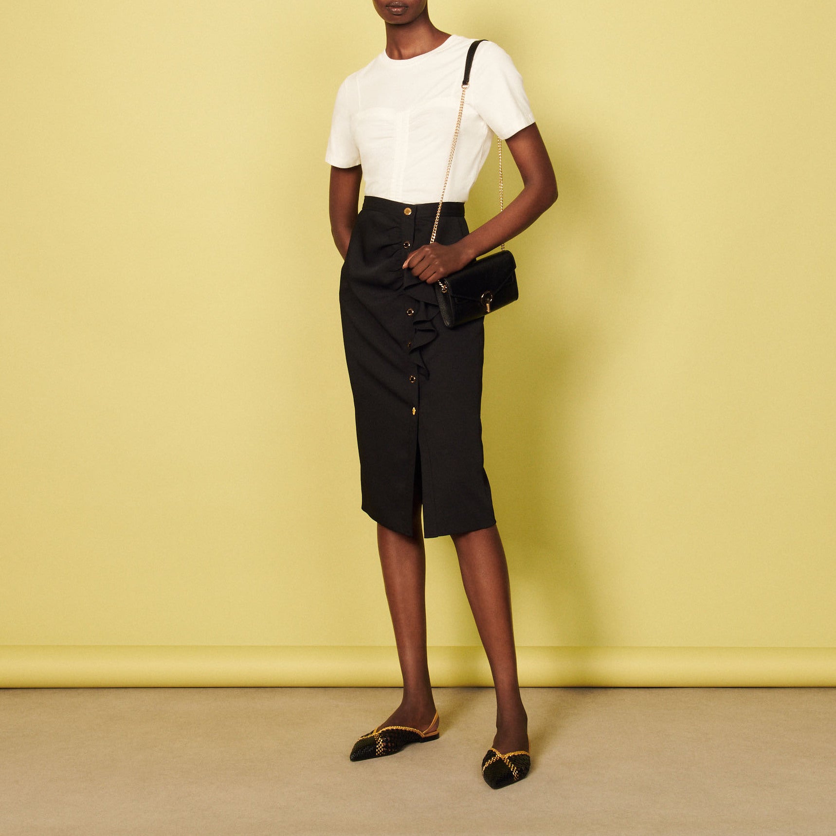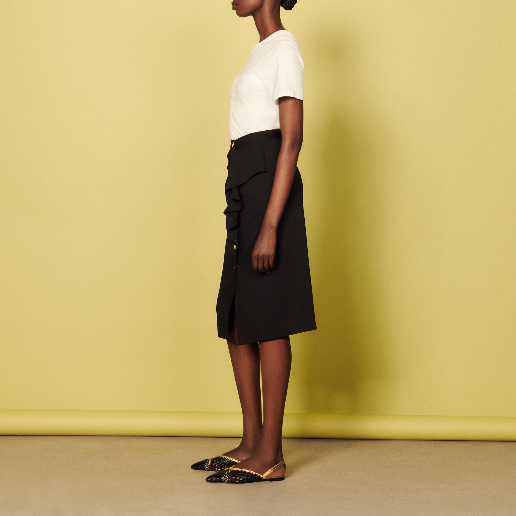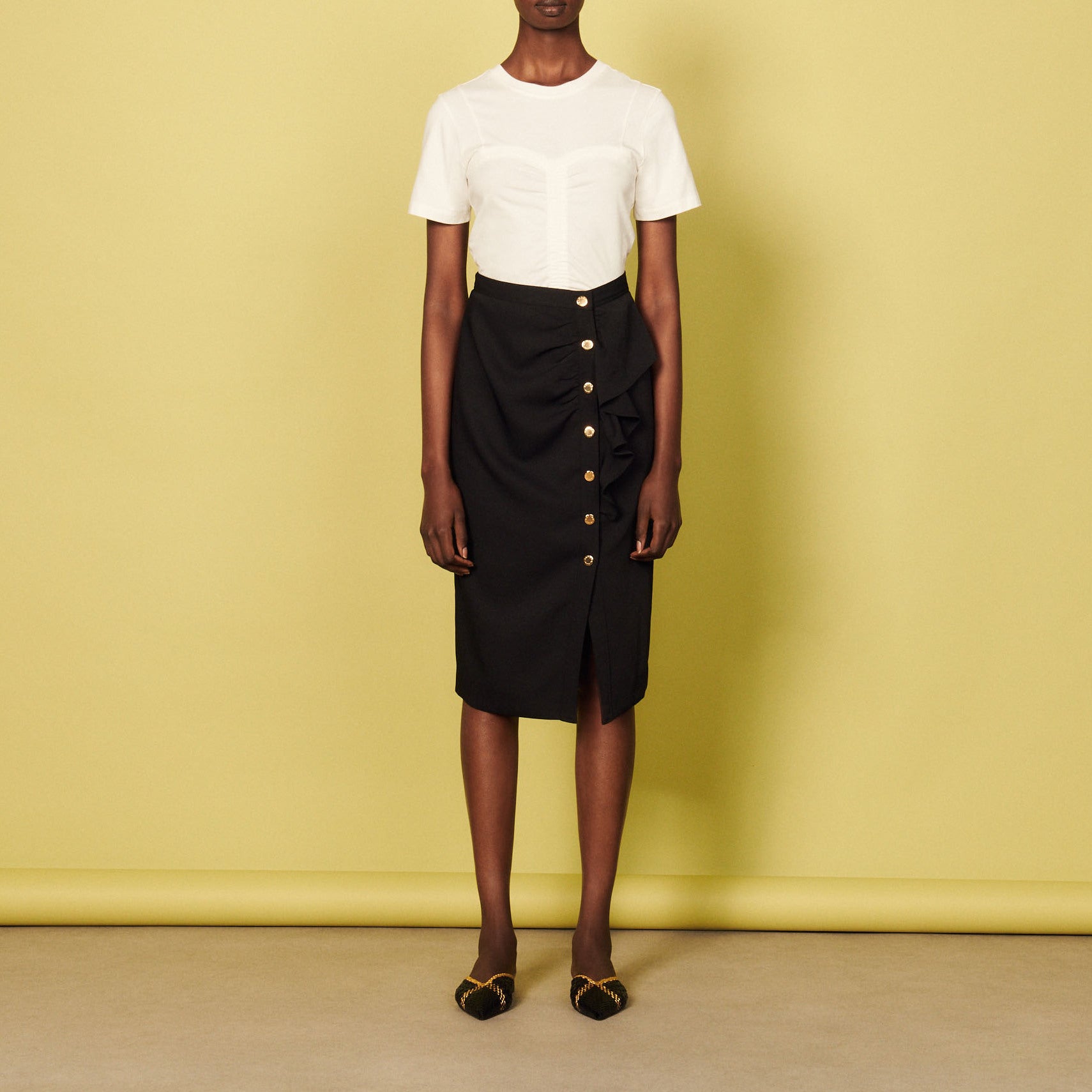 Straight midi skirt with a slit, side ruffle and gold-tone metal press studs.