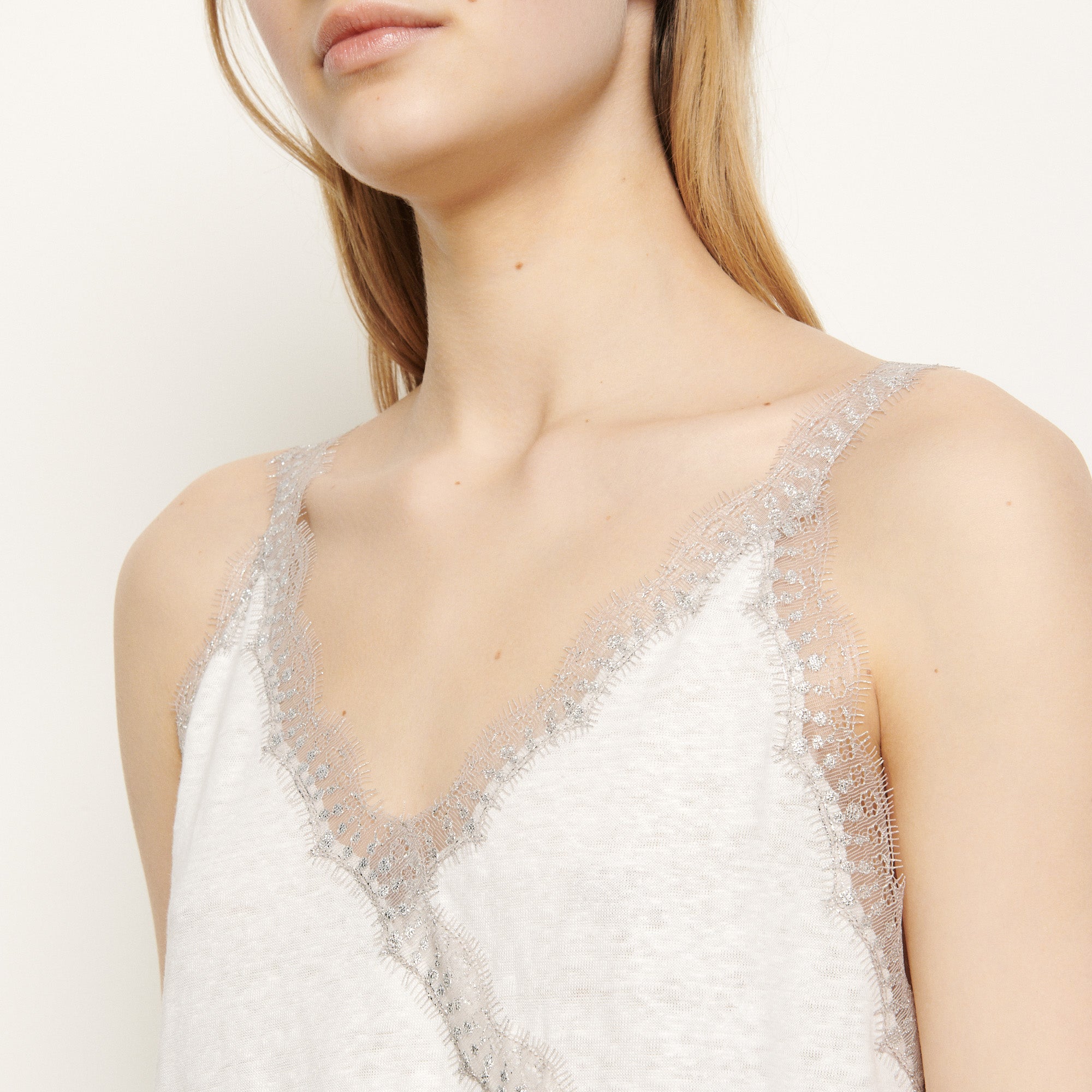 ; V-neck with with lace braid trim edging