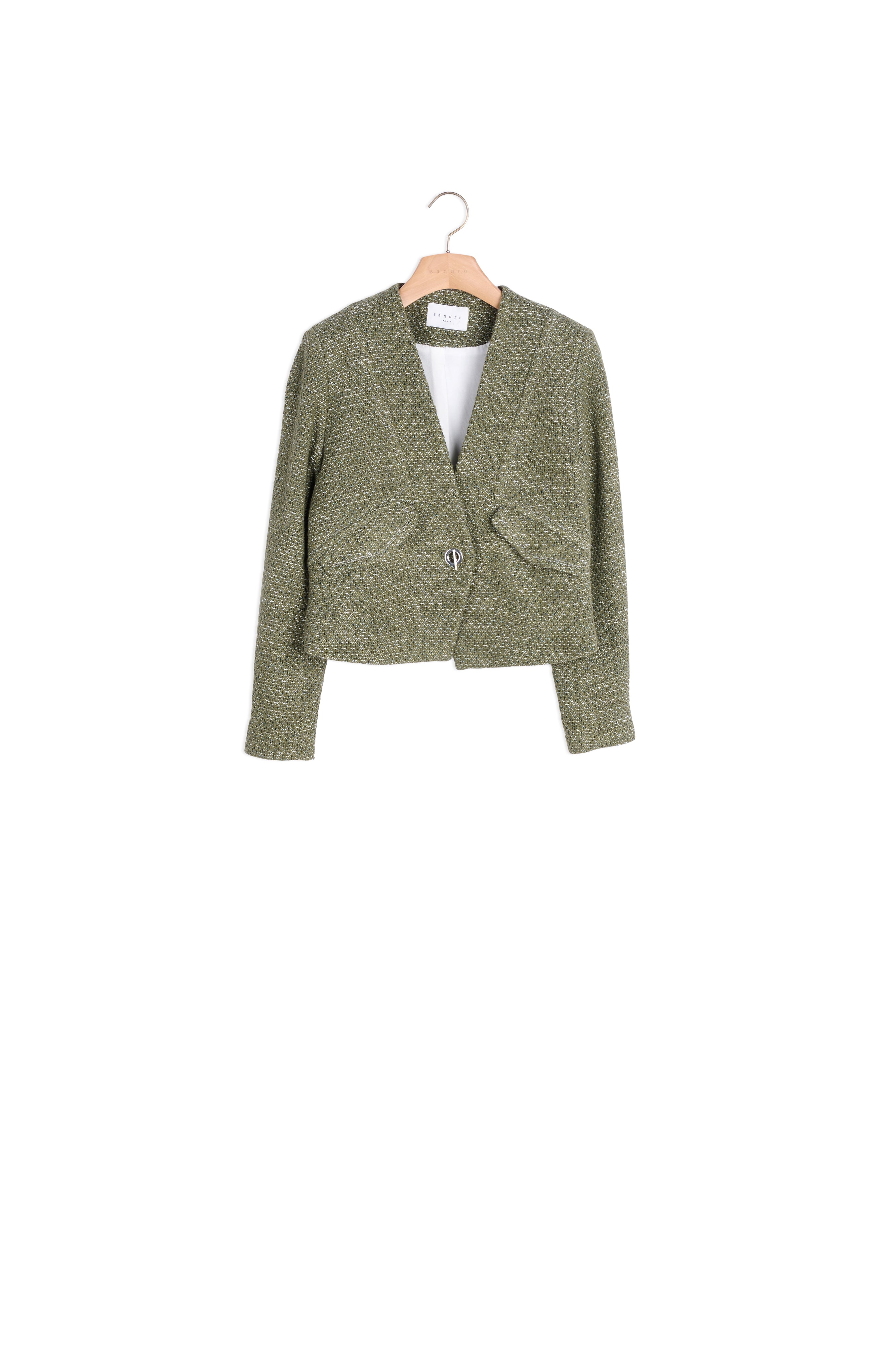 Chaqueta Sandro de manga larga Presenta dos bolsillos de solapa en los laterales Cierre de ojal de hierro Perfecta para un estilo retro y elegante La modelo lleva la talla 1