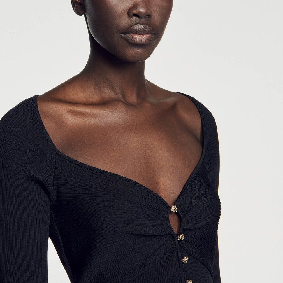 Cárdigan corto de punto de canalé con manga corta, escote de pico amplio y fruncido y cierre de botones de fantasía.