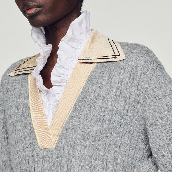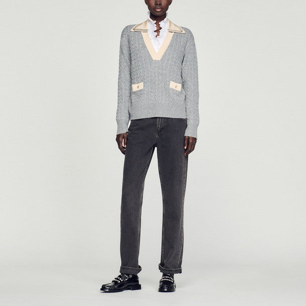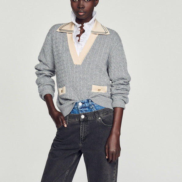 Jersey de cuello tipo chaquetón con escote profundo y manga larga de punto trenzado, sublimado con dos bolsillos de parche con un botón.