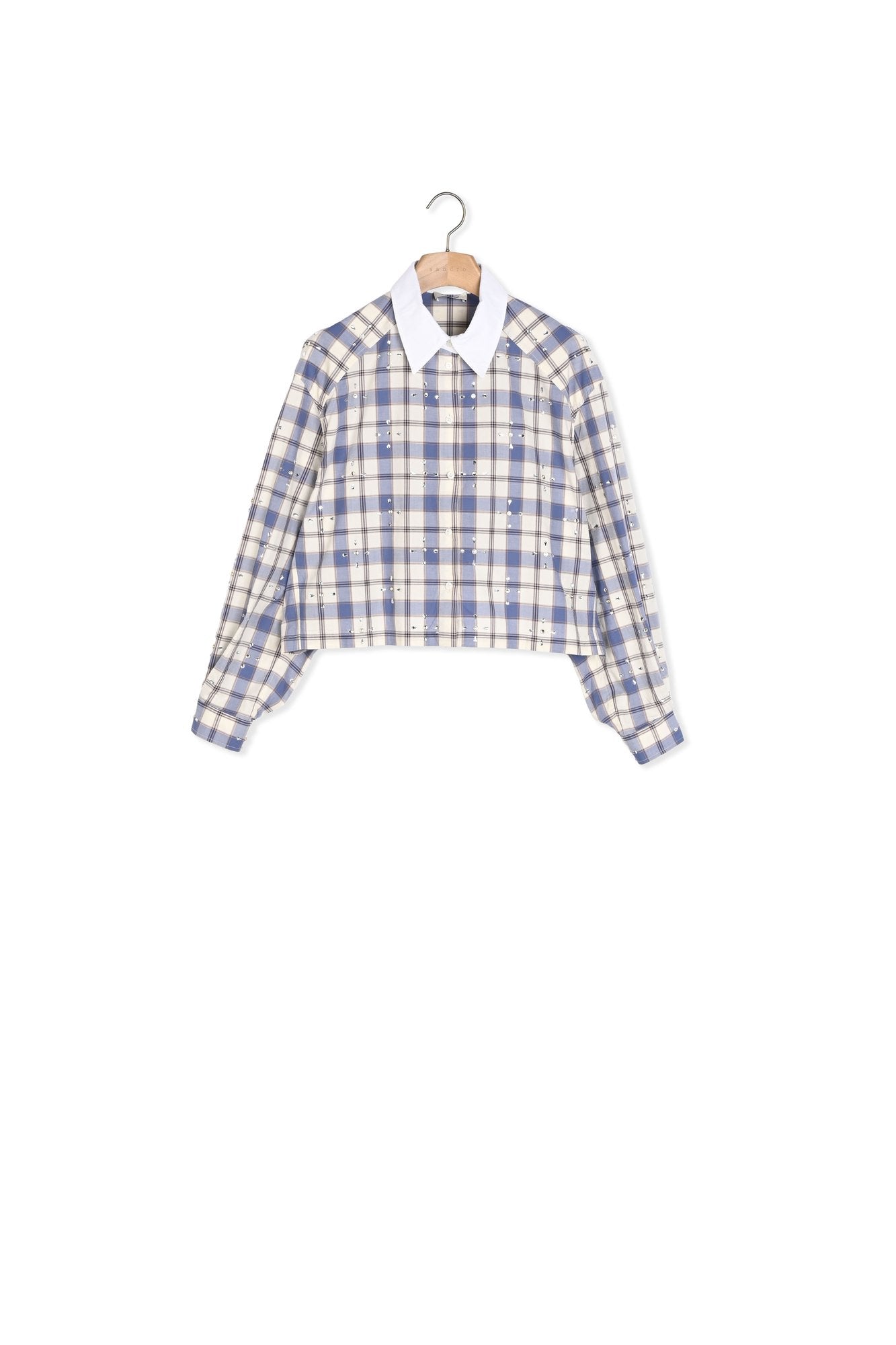 Camisa corta sin mangas con detalle de volantes, tapeta de botones y botón joya en el cuello.