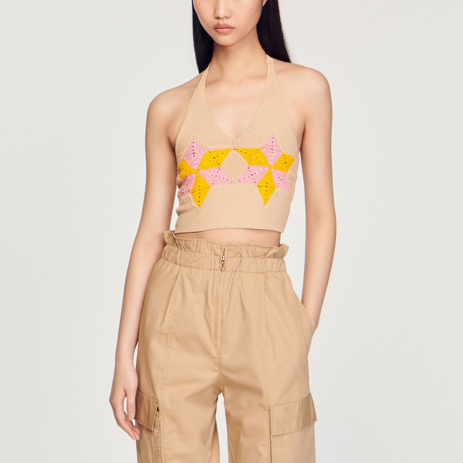 Top corto anudable en el cuello de escote en V y espalda desnuda de croché, sublimado con motivos de estrellas multicolores.