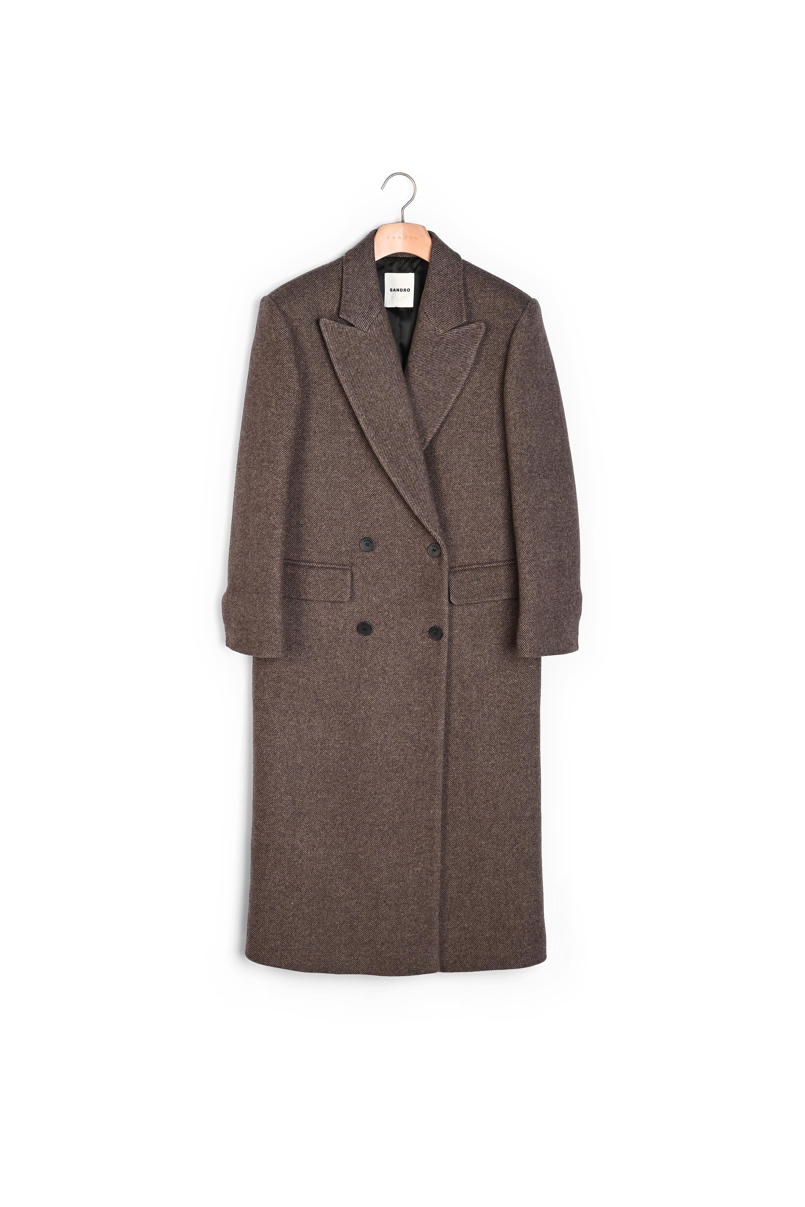 Abrigo largo y recto con abotonado cruzado, cuello sastre con solapas levantadas, mangas largas y bolsillos con solapa.
