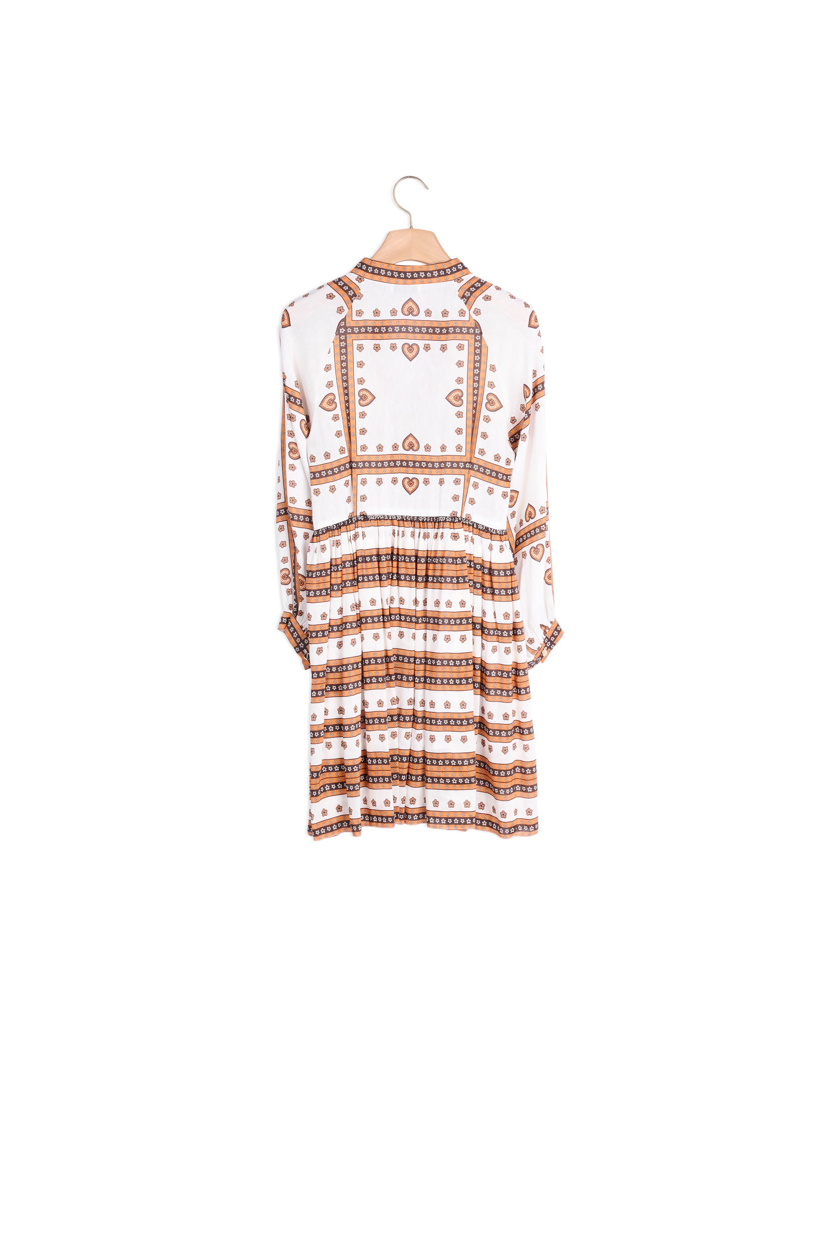 Vestido corto con escote en V sublimado con botones dorados, manga larga voluminosa, falda evasé y estampado Bandana.