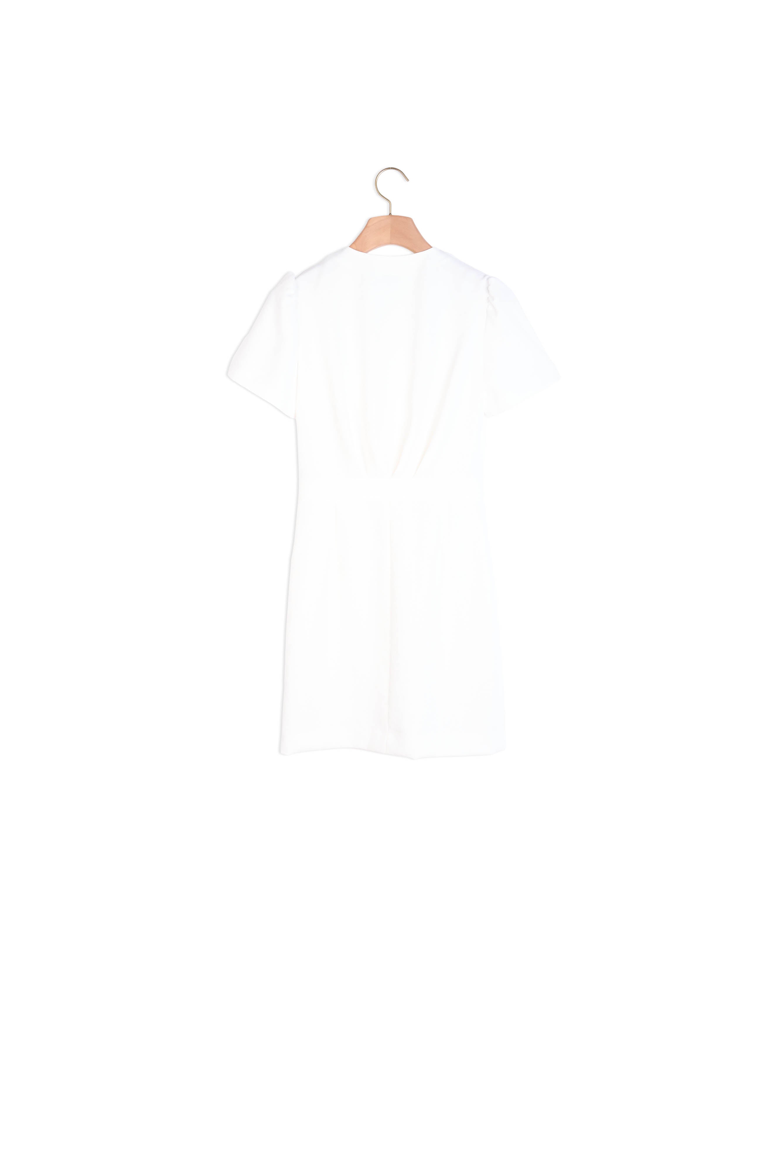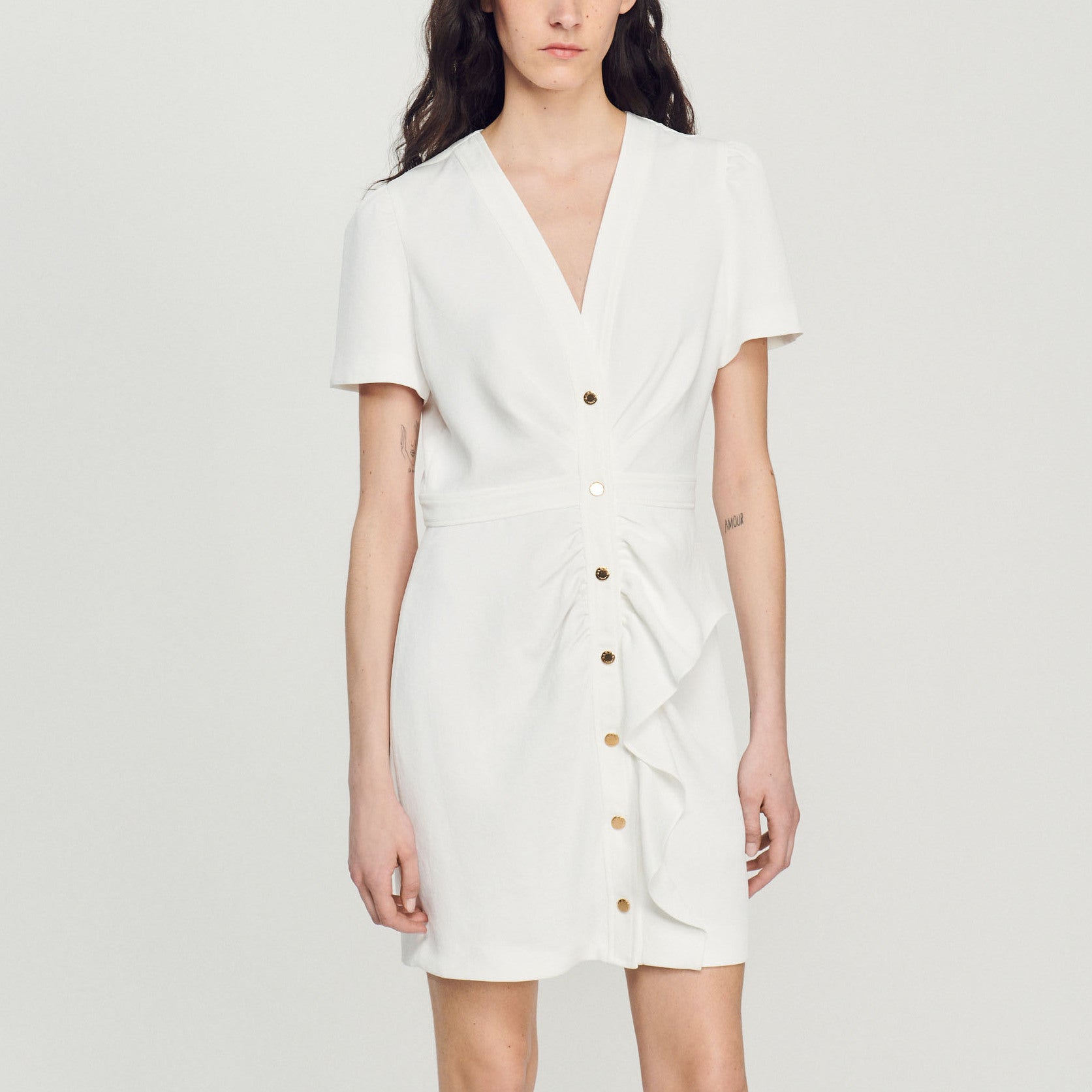 Vestido corto con cierre de botones fruncidos, escote en pico, manga corta y decorado con volante asimétrico.