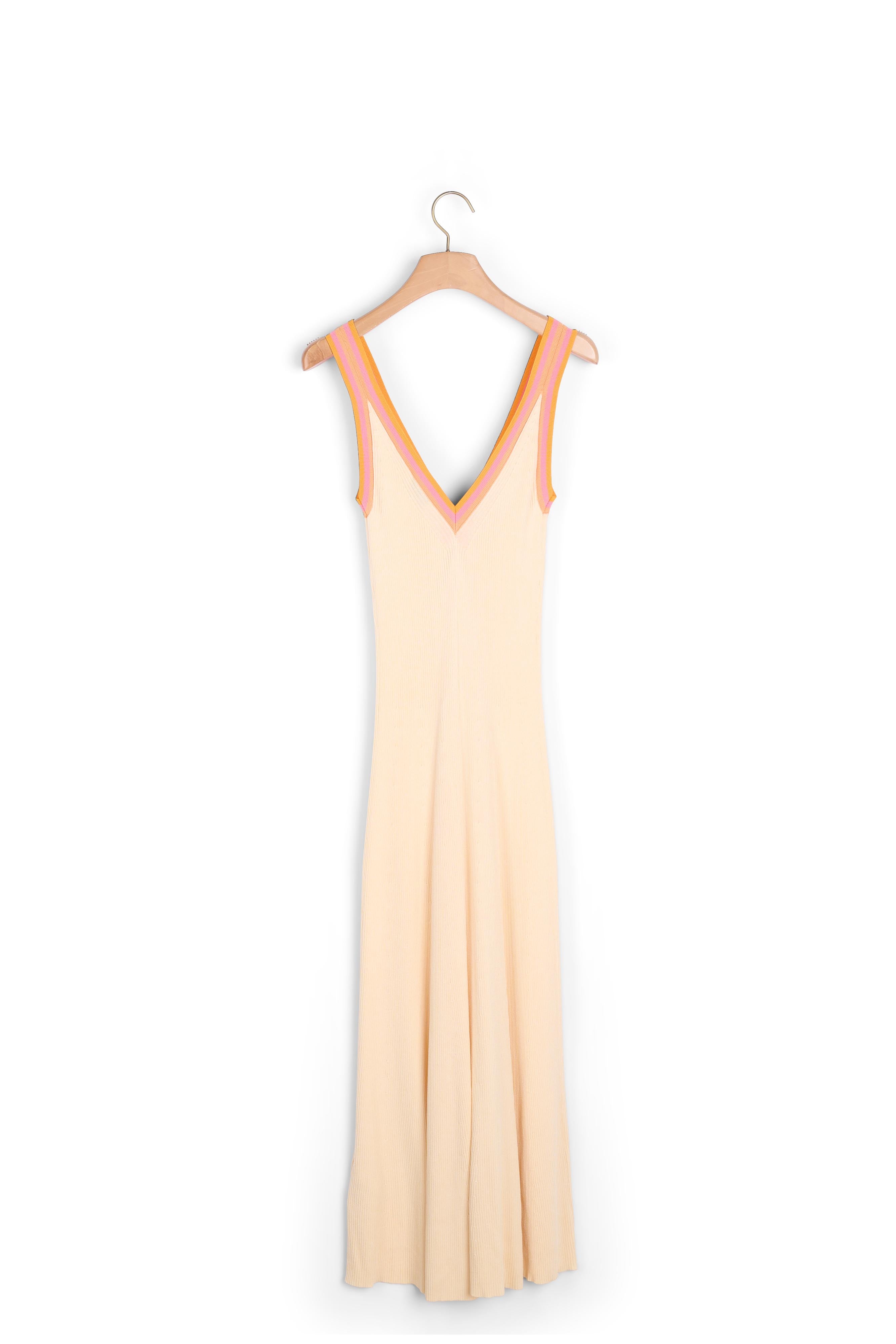 Vestido midi de punto de canalé bicolor con escote en V en las partes delantera y trasera.