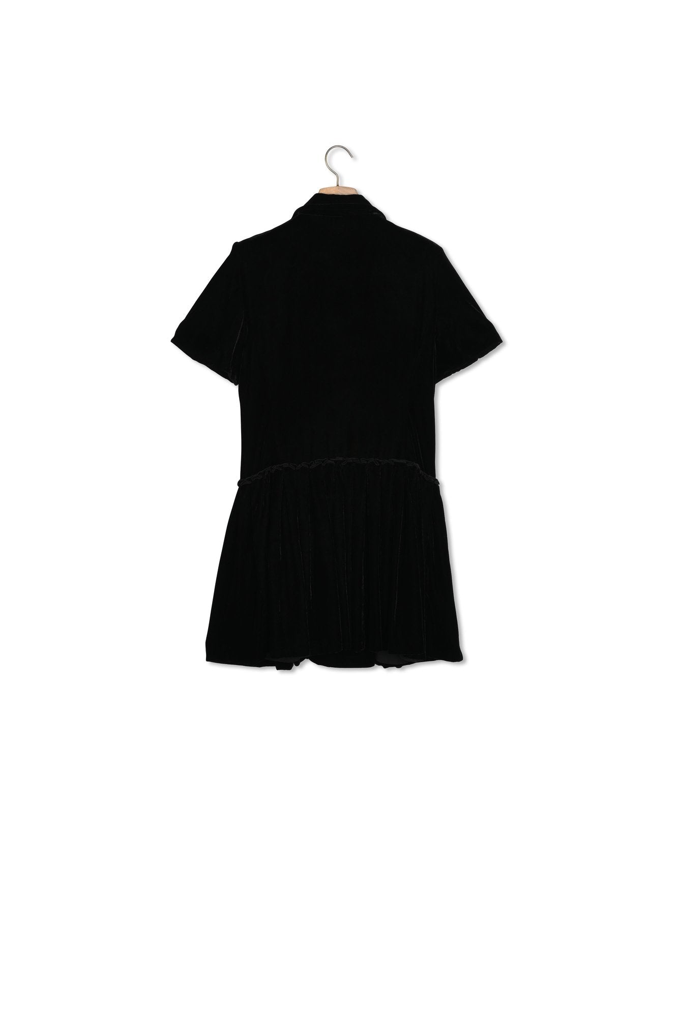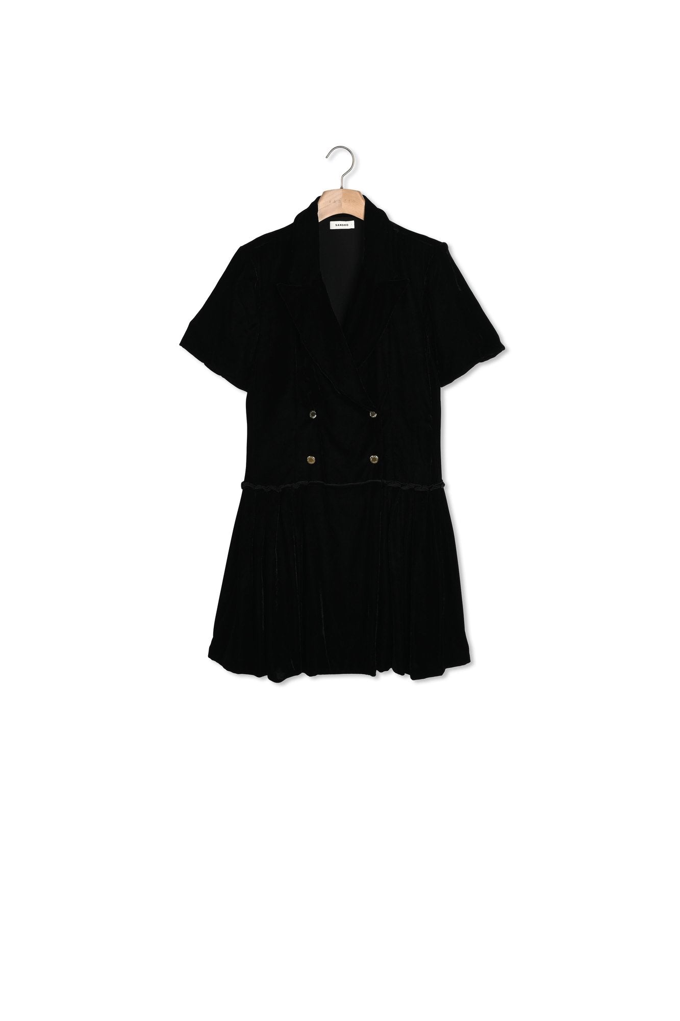 Vestido corto de guipur bicolor, con escote en V sublimado con botones forrados, manga corta y falda avolantada.