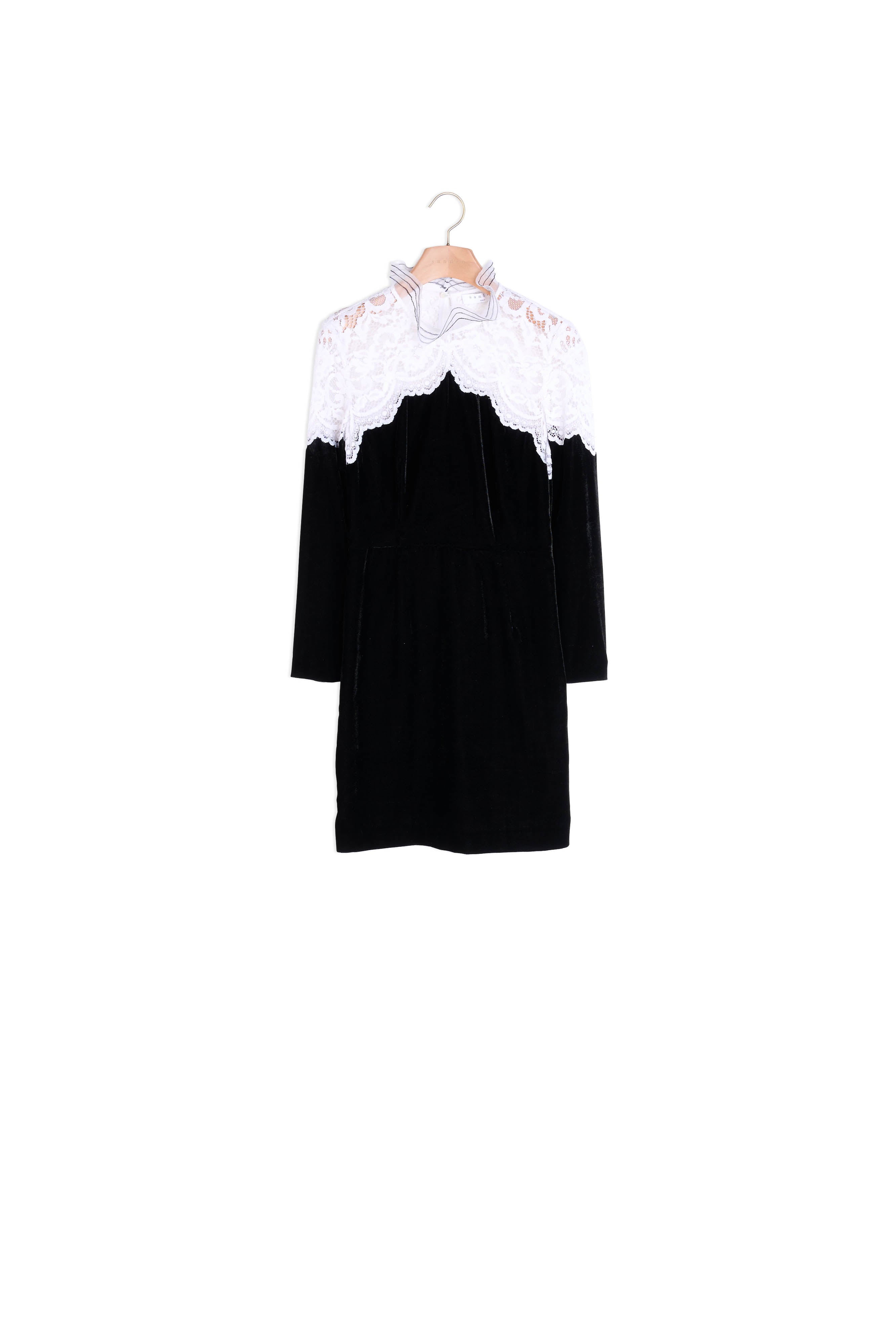 Robe courte Sandro; Col montant et manches longues; Insert de dentelle subtilement transparente au niveau du décolleté; Velours sur le reste de la robe; Cintré à la taille; Ouverture au dos fermée par un bouton; Présence d’une doublure; Le mannequin porte une taille 1 Référence : R5210H