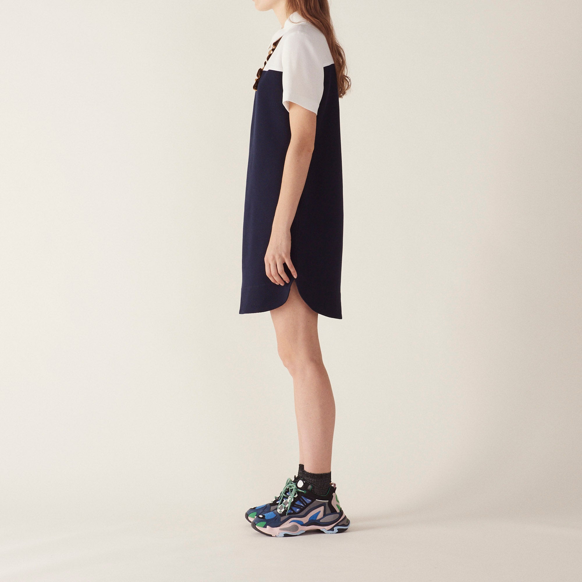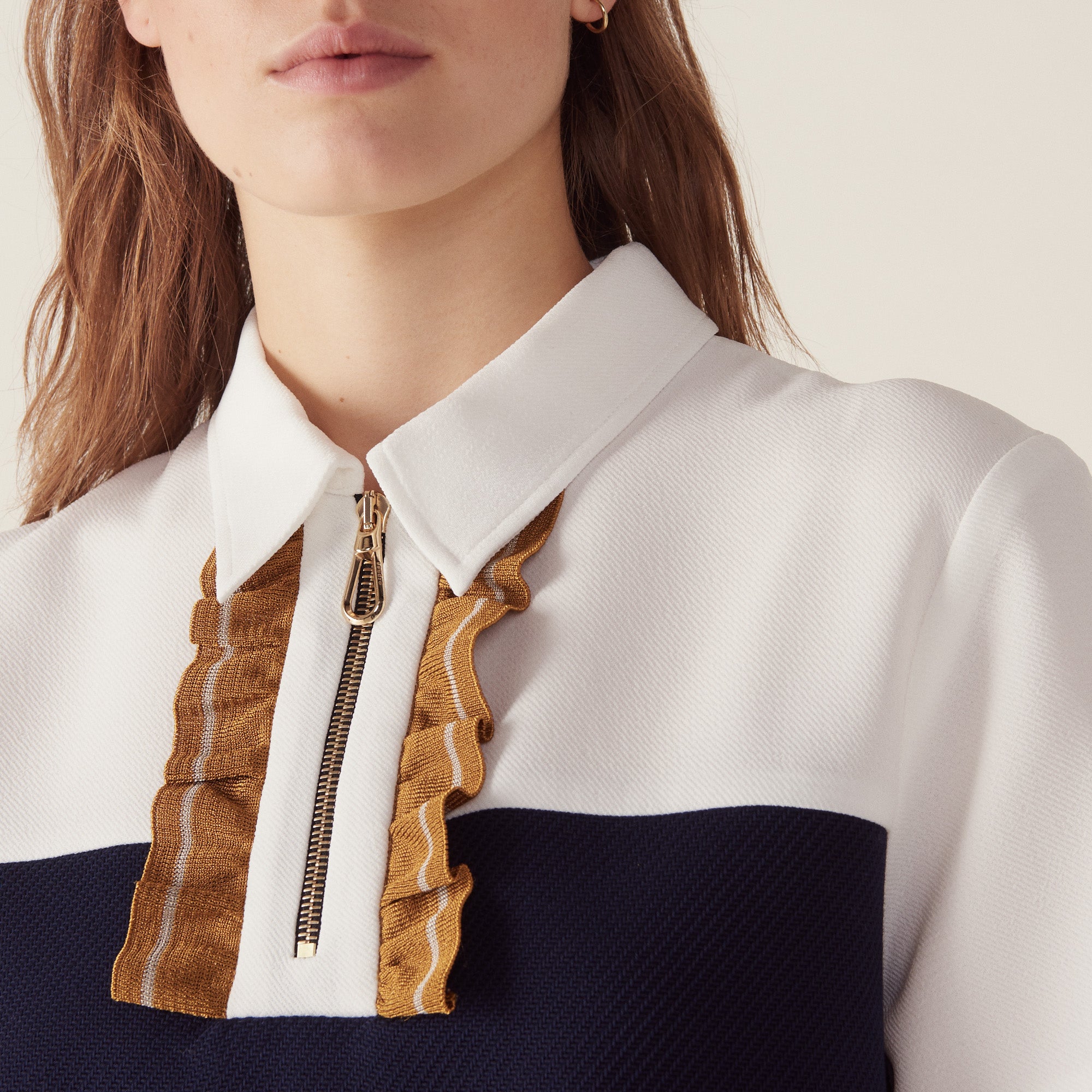 Robe courte bicolore Sandro; Robe courte bicolore; 100% coton; Coupe droite; Col chemise zippé orné d’un galon contrastant; Le mannequin porte une taille 36 Référence : R20465E