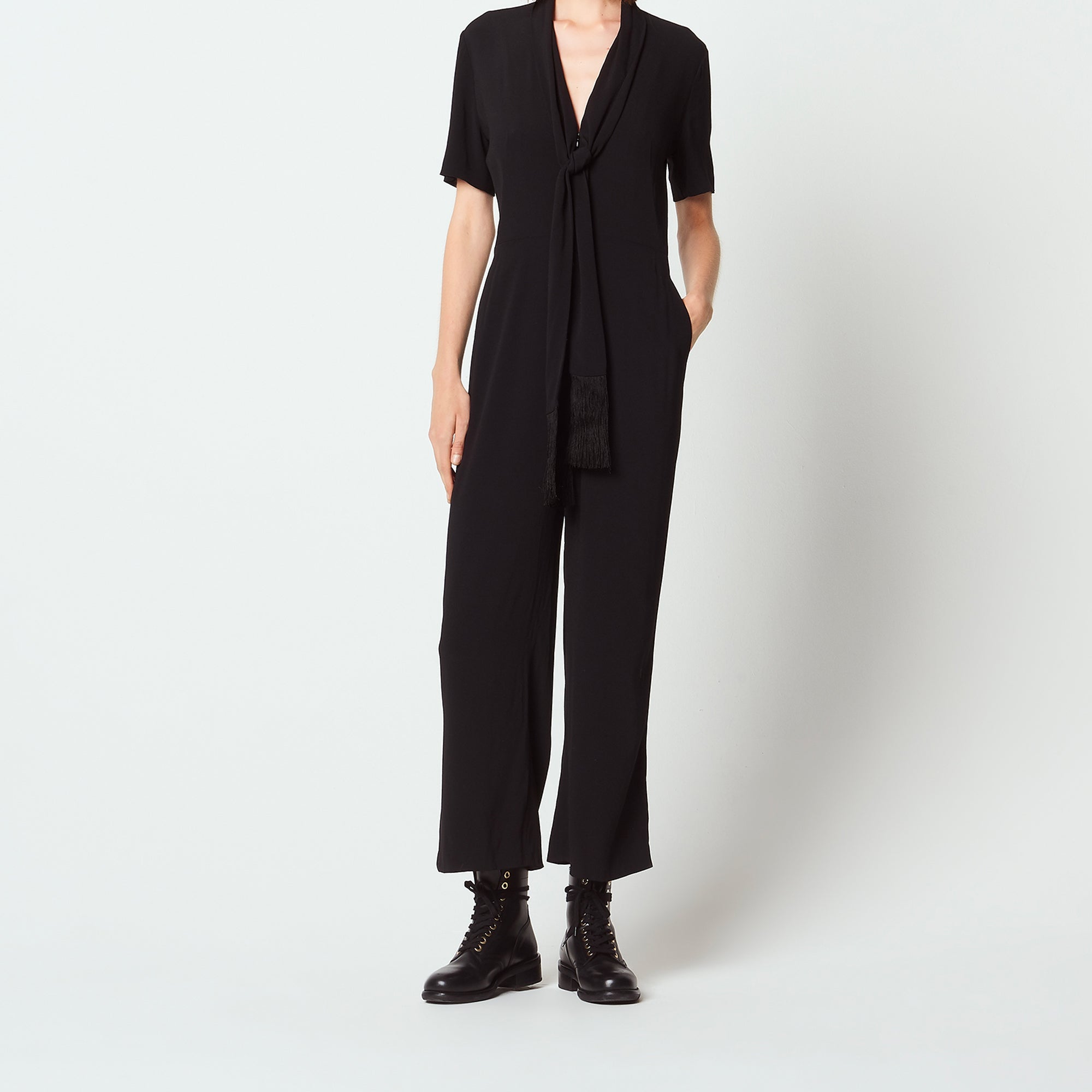 Combinaison pantalon Sandro ; Combinaison 7/8ème à manches courtes; Trompe l’œil façon écharpe frangée à nouer à l’encolure; Décolleté en V; Fermeture par un zip invisible au milieu devant; Deux poches latérales; Le mannequin porte une taille 36 Référence : P6436H