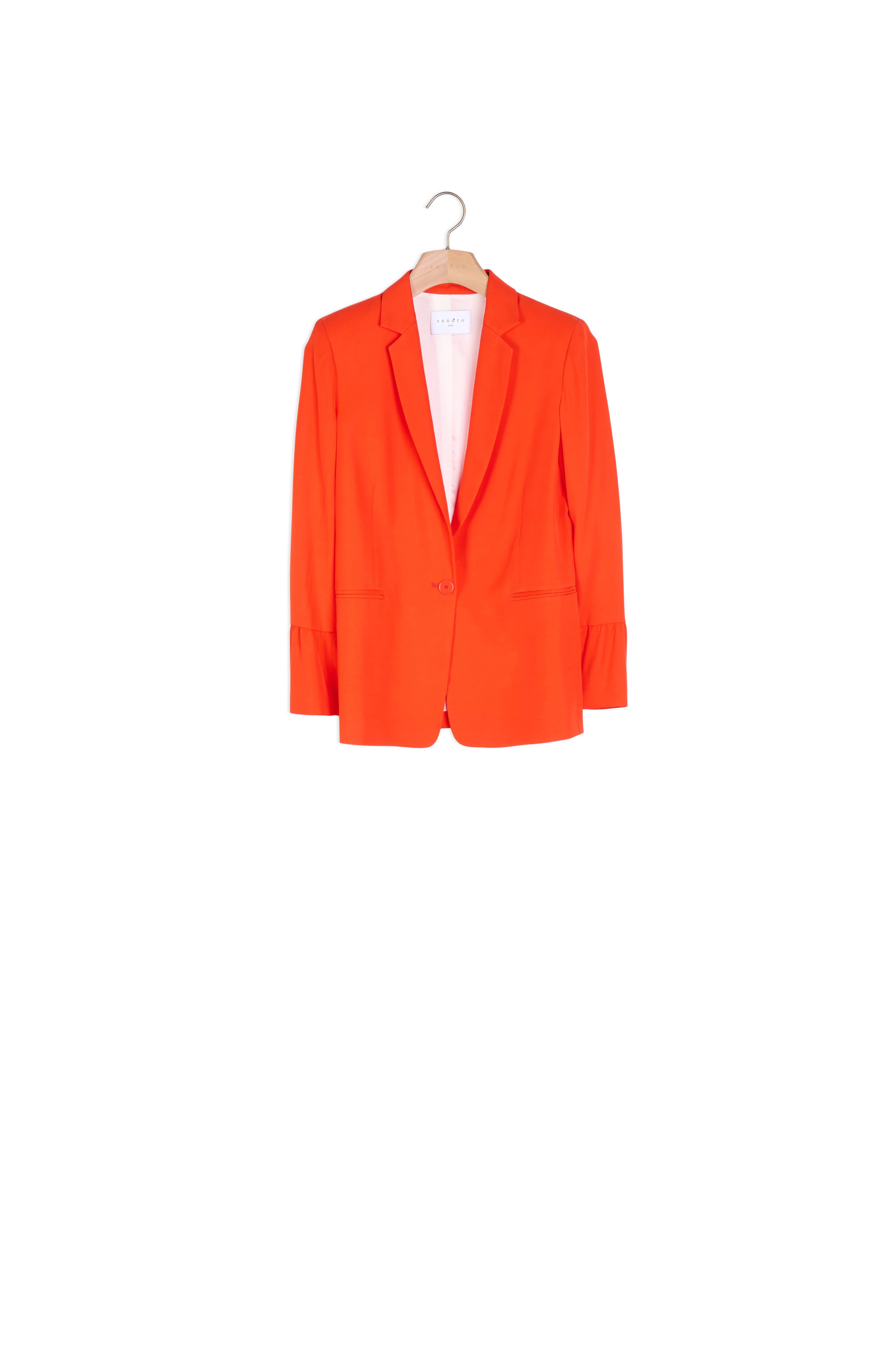 Veste de type tailleur Sandro; Col italien et manches longues; Volants au niveau des poignets; Deux poches passepoilées; Fermeture par un bouton sur le devant ; Le mannequin porte une taille 36 Référence : V6858E
