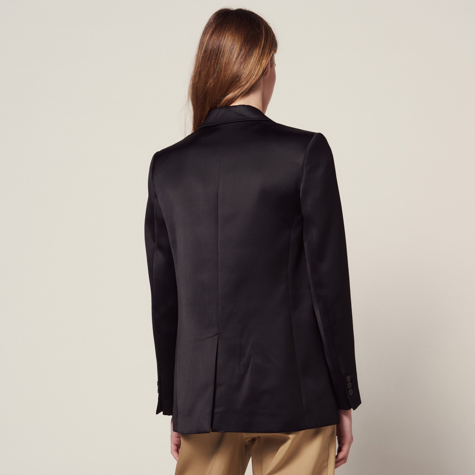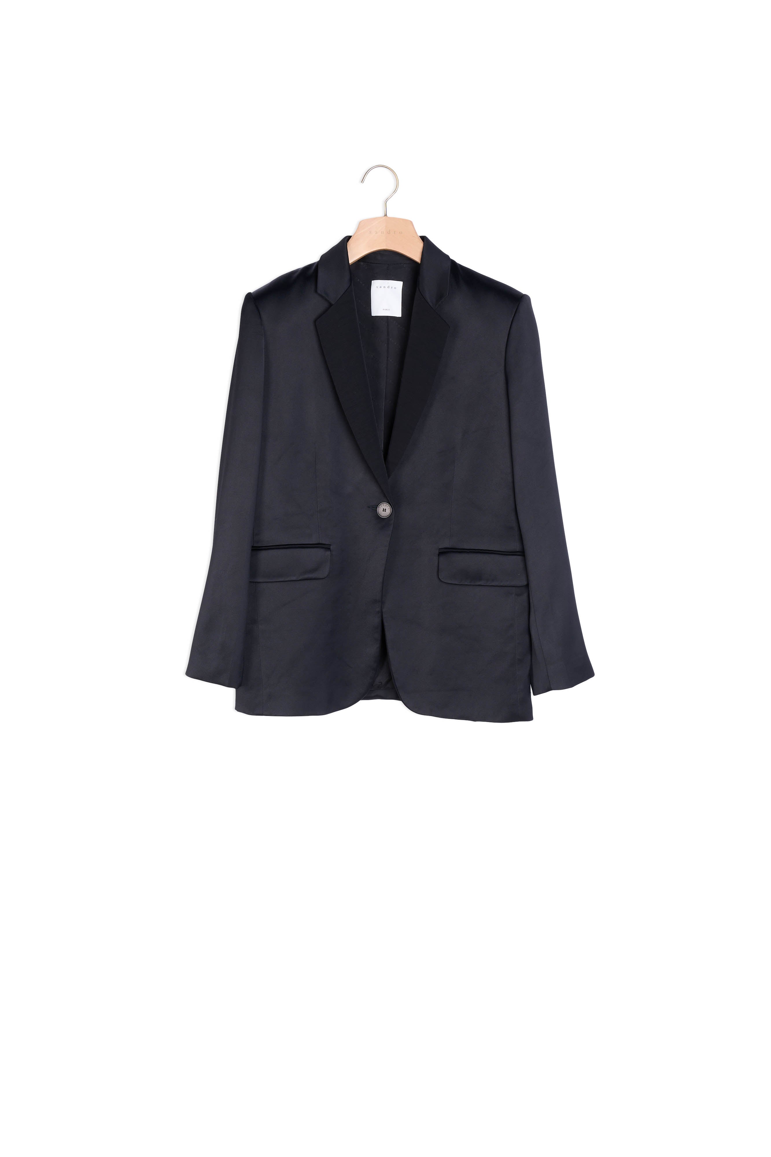 Veste de tailleur satinée femme Sandro; Manches longues; Col bi-matière à larges revers; Poches à revers sur le devant; Fermeture sur le devant par un bouton ton sur ton; Fente d'essence au dos de la veste; Poignets fermés par trois boutons ton sur ton; Le mannequin porte une taille 36 / UK 8 / US 26 Référence : V7460E