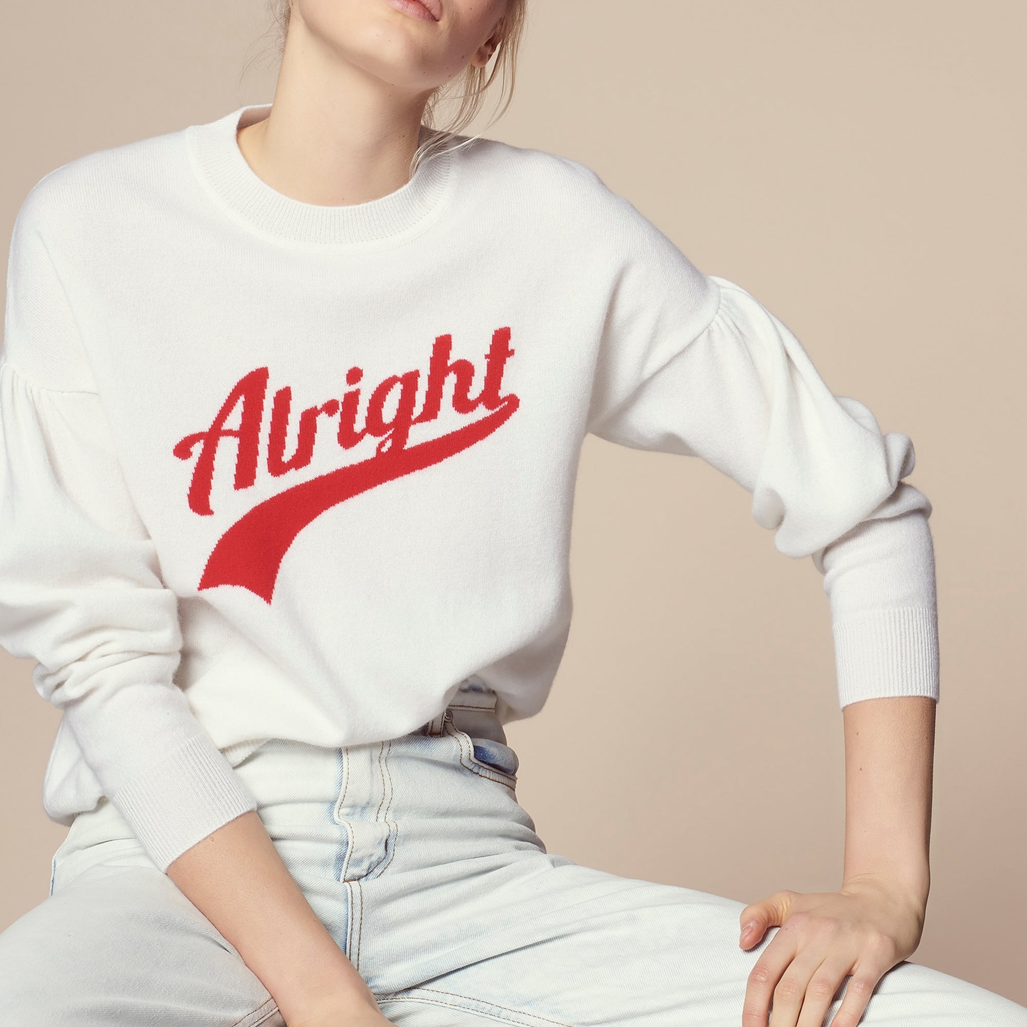 Pull Sandro; Col rond et manches courtes; Laine et cachemire; Sérigraphié « Alright »; Détail plissé au niveau des manches; Le mannequin porte une taille 1 Référence : S2455E