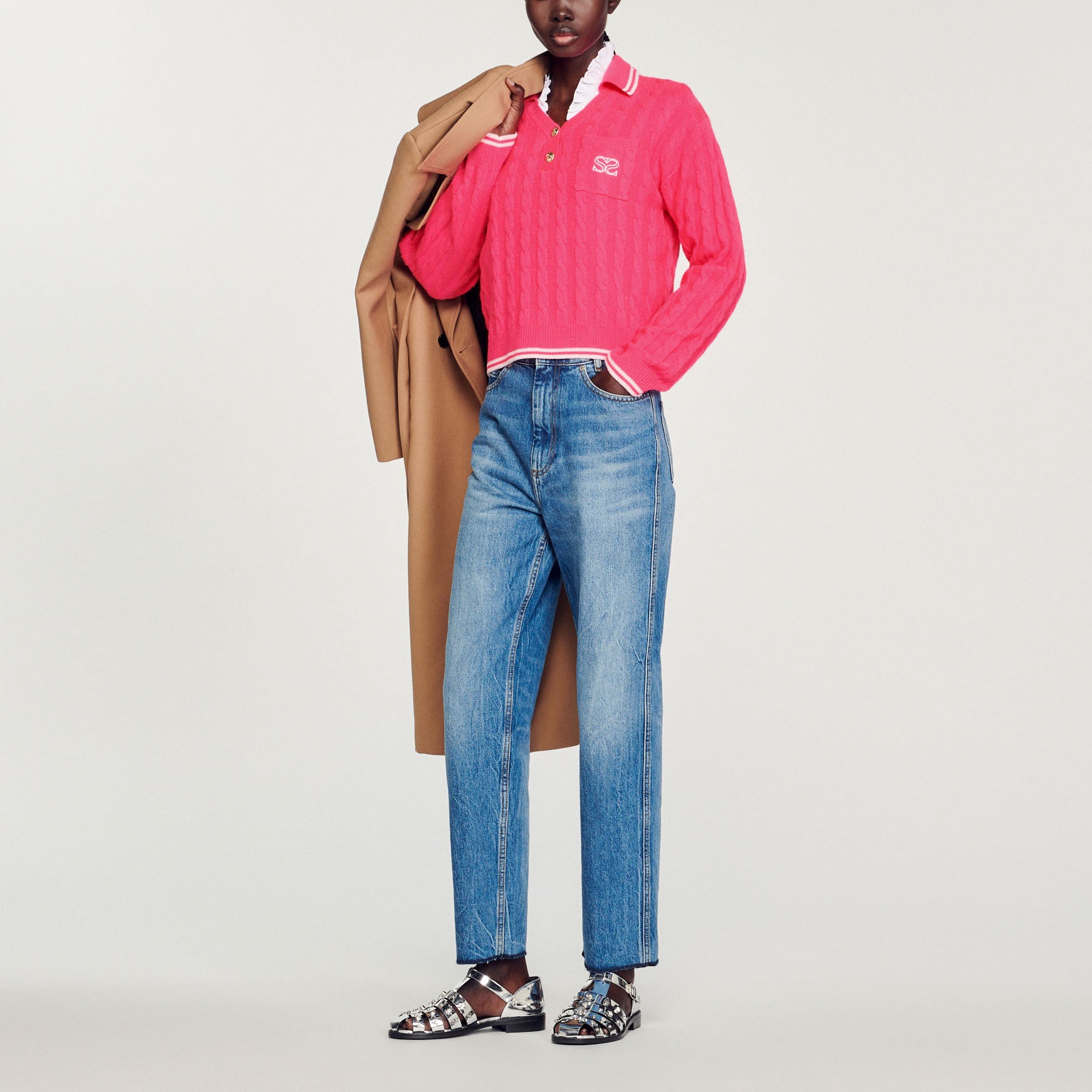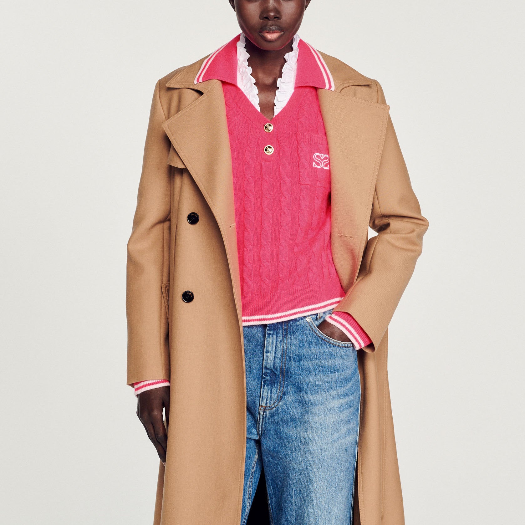 Pull en maille torsadée, muni d'un col polo ouvert à boutons travaillés, de manches longues, et d'une poche plaquée à la poitrine ornée d'une broderie double S.